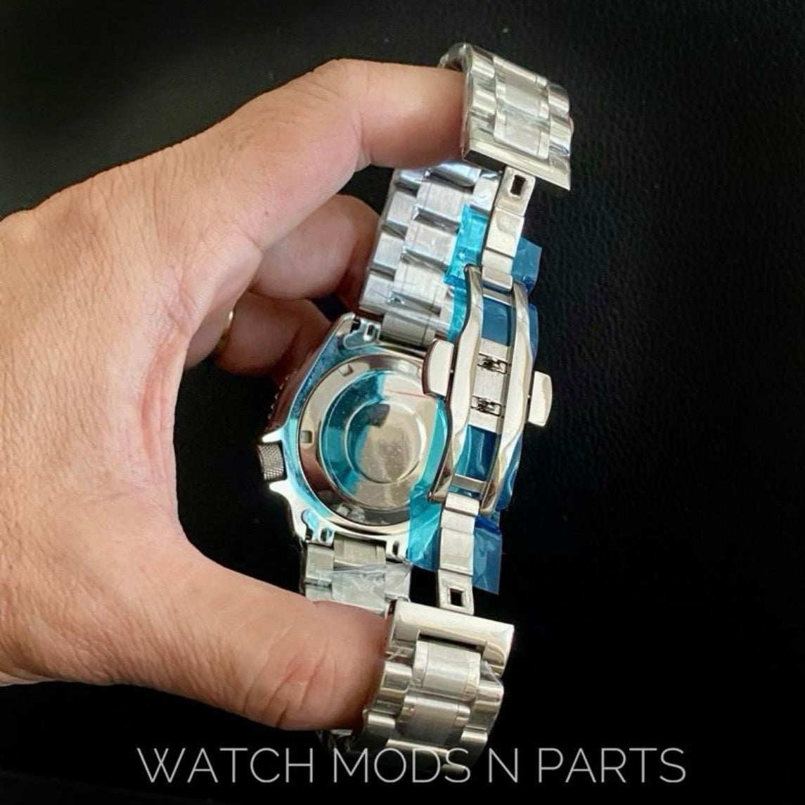 Custom mod (modification) watch, with seiko nh34 GMT movement. With GS Grand Seiko sea of cloud gmt dial blue GMT hands and GS style bracelet